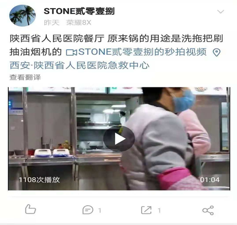 11月6日14:50,“西安直播”等微博號(hào)轉(zhuǎn)發(fā)網(wǎng)友爆料:“11月5號(hào),在西安市某醫(yī)院食堂內(nèi),清潔人員站在灶臺(tái)上在打掃油煙機(jī)上的污漬時(shí),竟直接把清潔油煙機(jī)的拖把放到灶臺(tái)上的鍋里清洗,絲毫不避諱外面的食客。目前,餐廳方面對(duì)此還未作出回應(yīng)!贝艘曨l同時(shí)被“新浪財(cái)經(jīng)”、“深圳商報(bào)”等多個(gè)媒體官微點(diǎn)名轉(zhuǎn)發(fā)。