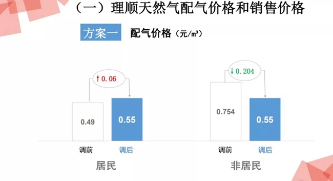 1、調整分類配氣價格。居民配氣價格由現(xiàn)行的0.49元每立方米調整為0.55元每立方米,上調0.06元每立方米,非居民配氣價格由現(xiàn)行0.754元每立方米調整為0.55元每立方米,下調0.204元每立方米。