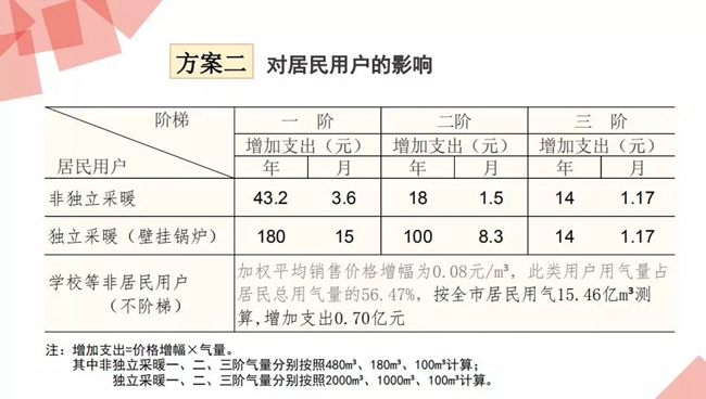 二是獨立采暖(壁掛鍋爐)居民用戶。按照調整后的居民用氣一階銷售價格,一階年最高氣量為2000立方米計算,每戶年增加支出240元,月增加支出20元;二階最高氣量1000立方米氣量計算,每戶年增加支出140元,月增加支出11.67元,對用氣量達到三階年最高氣量3000立方米以上的用戶,氣價增幅0.18元每立方米,用氣100立方米,增加支出18元。