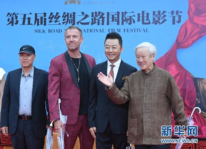 10月13日,第五屆絲綢之路國際電影節(jié)評委會成員謝飛、郭濤、雷尼·哈林、霍廷霄(從右至左)亮相紅毯。新華社記者 張博文 攝