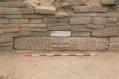 皇城臺考古工作啟動(dòng)于2016年,迄今持續(xù)工作三年,主要集中在東護(hù)墻北段上部、皇城臺門址和頂部大臺基區(qū)域,收獲重大。2018年,通過進(jìn)一步考古發(fā)掘,皇城臺臺頂格局和輪廓逐漸清晰?脊湃藛T發(fā)現(xiàn)皇城臺臺頂?shù)囊恍┐笮徒ㄖ湓谝惶帯笆痢钡拇笮团_基上,大致呈南北向長方形。大型臺基東西寬約80米、殘高約4米,南北長度約在120米以上!靶掳l(fā)現(xiàn)的30余件石雕作品集中出土于大型臺基南護(hù)墻墻體的倒塌石塊內(nèi),有一些還鑲嵌在南護(hù)墻墻面上!睋(jù)考古專家介紹,這些石雕絕大多數(shù)是雕刻在石塊一面的單面雕刻,雕刻內(nèi)容分為符號、人面、神面、動(dòng)物、神獸等,有一些畫面長度近3米,以中心神面為中心,兩側(cè)對稱雕出動(dòng)物和人面,體現(xiàn)出成熟的藝術(shù)構(gòu)思和精湛的雕刻技藝。本報(bào)記者 趙爭耀