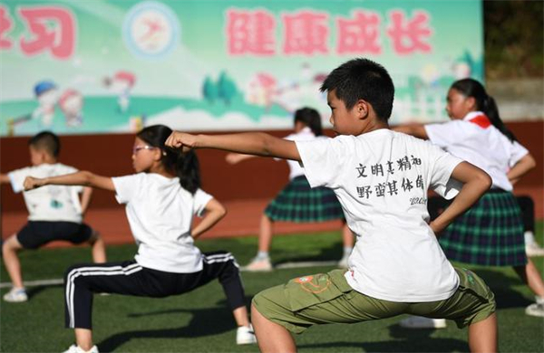 7月9日,在陜西省安康市平利縣老縣鎮(zhèn)中心小學(xué)的操場上,學(xué)生們在課后參加武術(shù)社團(tuán)活動(dòng)。新華社記者李一博 攝