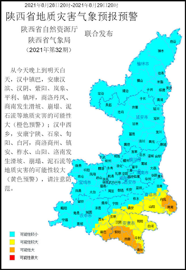 陜西省自然資源廳與陜西省氣象局聯(lián)合發(fā)布地質(zhì)災(zāi)害氣象預(yù)報(bào)預(yù)警:預(yù)計(jì)2021年8月28日20時(shí)至2021年8月29日20時(shí),漢中鎮(zhèn)巴,安康漢濱、漢陰、紫陽(yáng)、嵐皋、平利、鎮(zhèn)坪,商洛丹鳳、商南發(fā)生滑坡、崩塌、泥石流等地質(zhì)災(zāi)害的可能性較大(橙色預(yù)警);漢中西鄉(xiāng),安康寧陜、石泉、旬陽(yáng)、白河,商洛商州、鎮(zhèn)安、柞水、山陽(yáng)、洛南發(fā)生滑坡、崩塌、泥石流等地質(zhì)災(zāi)害的可能性較大(黃色預(yù)警),請(qǐng)注意防范。fVX安康新聞網(wǎng)