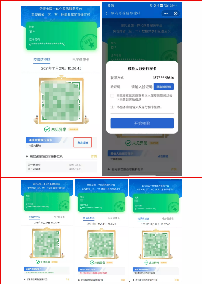 居民可在微信或支付寶中打開陜西健康碼小程序的“我的防控碼”界面,就能看到在防控碼下方專有一欄“通信大數據行程卡”,“點擊核驗”即可根據陜西疫情防控碼所綁定手機號查詢最近14天是否到過中高風險地區(qū)。并且疫情防控碼頁面上僅保留當日的核驗結果,如第二天使用需要再次點擊核驗。