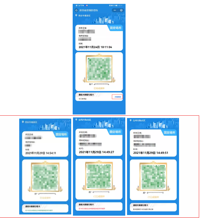 升級后的陜西省疫情防控碼與通信大數據行程卡(即行程卡)實現“卡碼融合”,無需跳轉,同一界面即可實現疫情防控碼、行程卡、疫苗接種等信息的顯示。