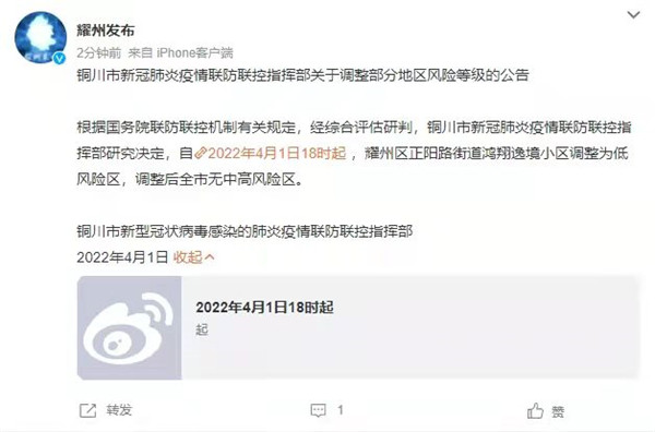 根據(jù)國(guó)務(wù)院聯(lián)防聯(lián)控機(jī)制有關(guān)規(guī)定,經(jīng)綜合評(píng)估研判,銅川市新冠肺炎疫情聯(lián)防聯(lián)控指揮部研究決定,自2022年4月1日18時(shí)起 ,耀州區(qū)正陽(yáng)路街道鴻翔逸境小區(qū)調(diào)整為低風(fēng)險(xiǎn)區(qū),調(diào)整后全市無(wú)中高風(fēng)險(xiǎn)區(qū)。
