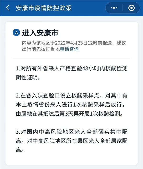 陜西省內(nèi)各市最新的疫情防控政策來(lái)了。ń刂4月23日)建議出行先撥打當(dāng)?shù)仉娫捵稍儯?/strong>M2Z安康新聞網(wǎng)