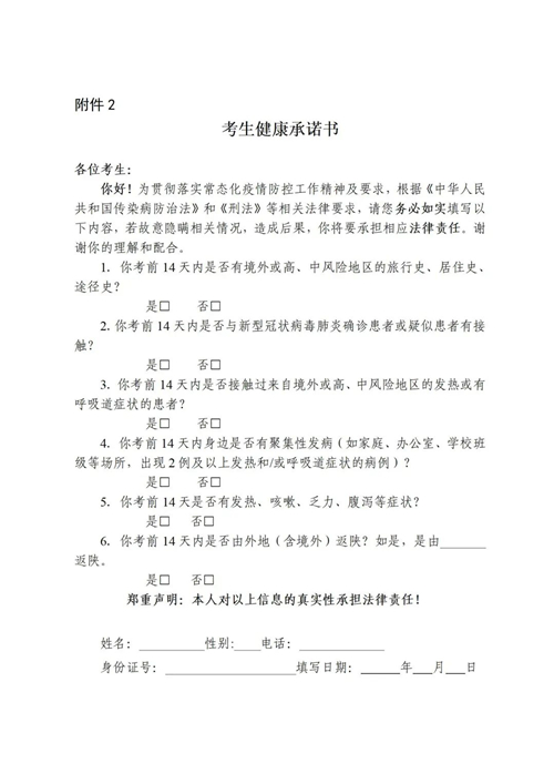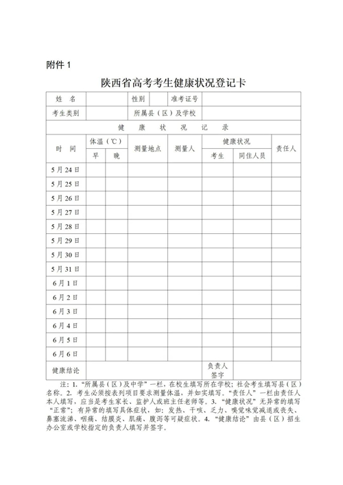 健康監(jiān)測。考生在高考前14天到高考結(jié)束應(yīng)進(jìn)入靜態(tài)管理,堅(jiān)持做到非必要不流動,不到人群流動性較大的場所活動,不接觸有疫情風(fēng)險(xiǎn)的人員,做好每日體溫測量、記錄并進(jìn)行健康狀況監(jiān)測,填寫《陜西省高考考生健康狀況登記卡》(附件1)和《考生健康承諾書》(附件2)。考生健康如出現(xiàn)異常狀況應(yīng)立即向?qū)W校和高考報(bào)名地考試機(jī)構(gòu)報(bào)告,不得謊報(bào)、瞞報(bào)。