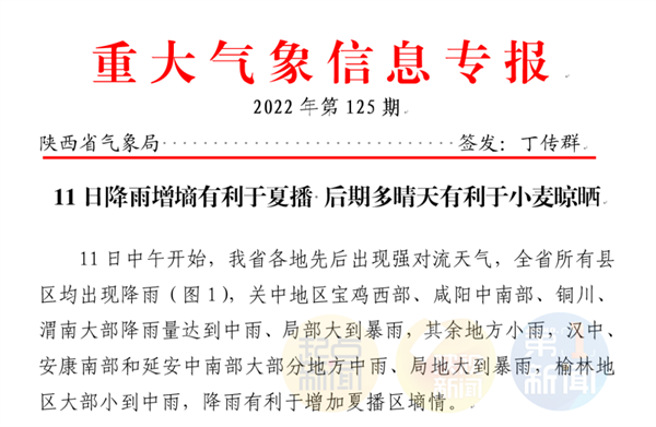 6月12日13時(shí),陜西省氣象臺(tái)發(fā)布重大氣象信息專報(bào)。