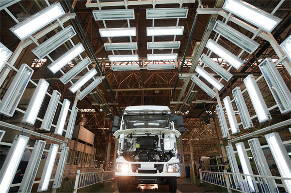 5月24日,在陜西汽車控股集團(tuán)有限公司總裝車間,一輛裝配完畢的陜汽重型卡車等待驗收。新華社記者 李一博 攝