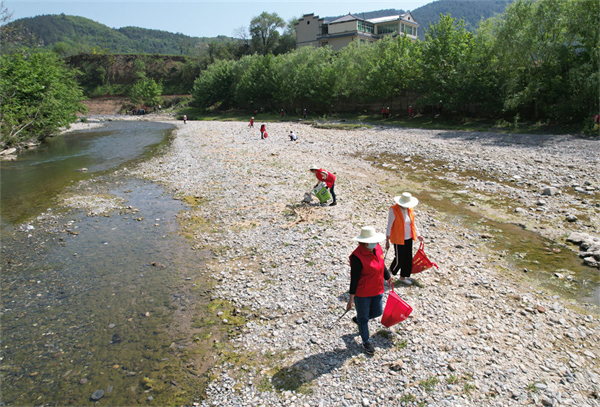 4月10日,女子志愿護(hù)河隊隊員在陜西省旬陽市雙河鎮(zhèn)高坪社區(qū)河邊撿拾垃圾(無人機(jī)照片)。新華社記者 邵瑞 攝