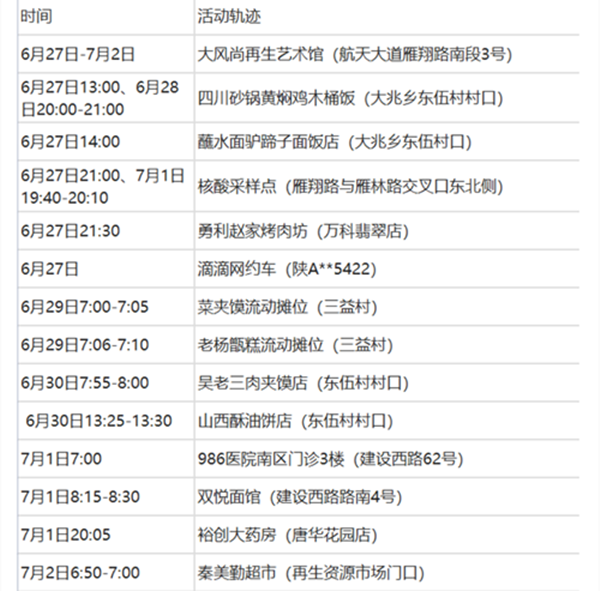7月2日0-18時,西安市新增1例本土確診病例,系重點人群核酸篩查中發(fā)現(xiàn)。6月19日、21日、24日、28日核酸檢測結(jié)果均為陰性,7月2日7時40分混檢結(jié)果異常,7月2日13時,西安市疾病預(yù)防控制中心單檢結(jié)果陽性,經(jīng)市級專家組診斷為確診病例(輕型),主要活動軌跡如下:au7安康新聞網(wǎng)