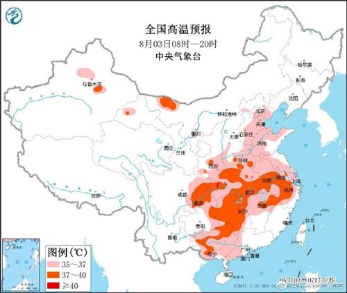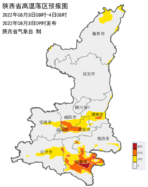 2022年8月3日10時00分,陜西省氣象臺發(fā)布高溫黃色預(yù)警 :受大陸高壓影響,3日榆林北部、關(guān)中大部、陜南大部地方有35℃以上的高溫天氣,其中咸陽南部、楊凌、西安大部、渭南南部、漢中東部、安康部分地方可達(dá)37℃以上,安康平原地區(qū)局地可達(dá)40℃以上。