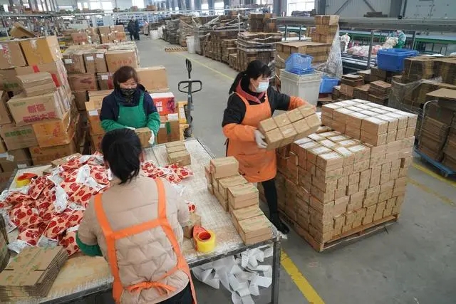 2月6日,陜西美農(nóng)網(wǎng)絡(luò)科技有限公司的工人在物流倉(cāng)內(nèi)打包食品快遞包裹。(新華社記者邵瑞 攝)
