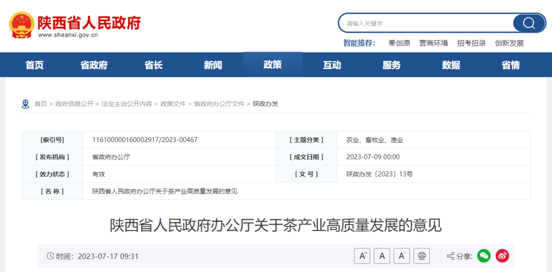 陜西省人民政府辦公廳關(guān)于茶產(chǎn)業(yè)高質(zhì)量發(fā)展的意見
