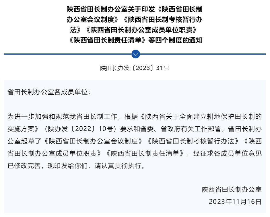 陜西省田長制辦公室印發(fā)通知公布四個(gè)制度