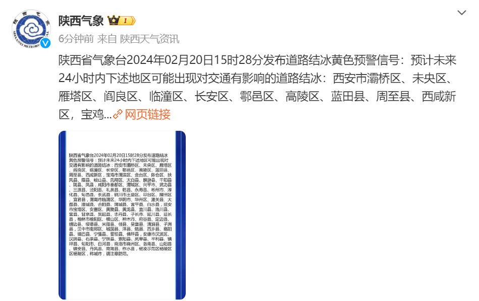陜西省氣象臺2024年02月20日15時28分發(fā)布道路結冰黃色預警信號,預計未來24小時內下述地區(qū)可能出現(xiàn)對交通有影響的道路結冰: