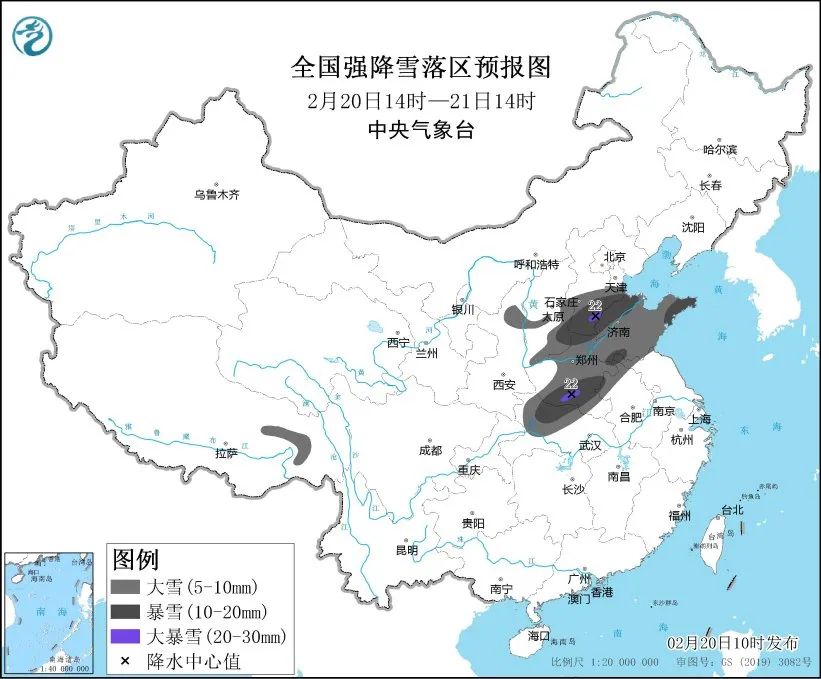 20日至22日,中東部地區(qū)將出現(xiàn)大范圍雨雪天氣。預計2月20日14時至2月21日14時,陜西北部、山西東南部、河北南部、山東、河南、安徽北部、湖北西部、西藏東部等地部分地區(qū)有大到暴雪,其中,河北南部、河南南部等地局地有大暴雪(20~22毫米)。上述部分地區(qū)新增積雪深度3~8厘米,局地可達12厘米以上。