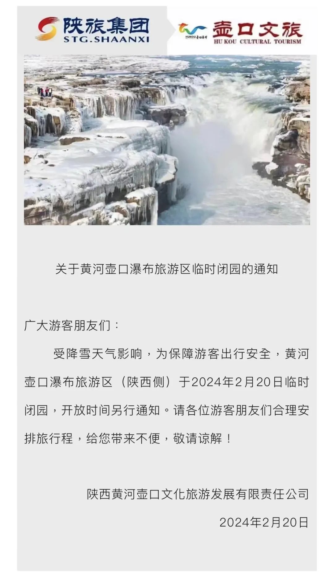 黃河壺口瀑布旅游區(qū)臨時閉園:受降雪天氣影響,為保障游客出行安全,黃河壺口瀑布旅游區(qū)(陜西側)于2024年2月20日臨時閉園,開放時間另行通知。請各位游客朋友們合理安排旅行程,給您帶來不便,敬請諒解!