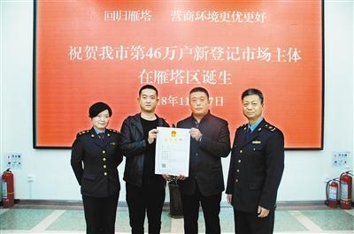 西安市工商局雁塔分局向新登記的第46萬戶市場主體頒發(fā)營業(yè)執(zhí)照 原標(biāo)題:今年西安新登記市場主體突破46萬戶 今年以來,西安市各級(jí)各部門深入開展“行政效能革命……