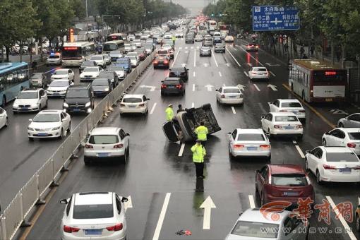 雨天路滑太白南路一轎車側(cè)翻路中間,幸無人員傷亡