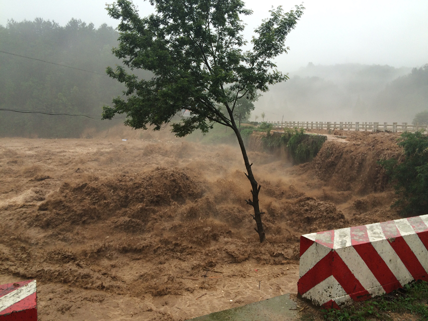 6月28日,南鄭縣牟家壩鎮(zhèn)一村子,洪水即將漫上公路 記者曾春 攝連日暴雨,讓漢中多地受災(zāi)。昨日,南鄭縣8人被困二樓房上,去救援的消防車也困在公路被水圍住。暴……