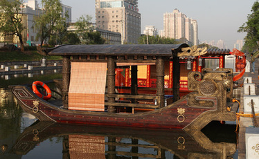 這艘仿古船有十七八米長(zhǎng),船內(nèi)裝飾精美。西部網(wǎng)訊(記者 魏永賢) 4月22日早晨,西安城墻南門西側(cè)護(hù)城河上停泊著7艘“秦、漢、唐”等不同主題的仿古游船。船舶古……