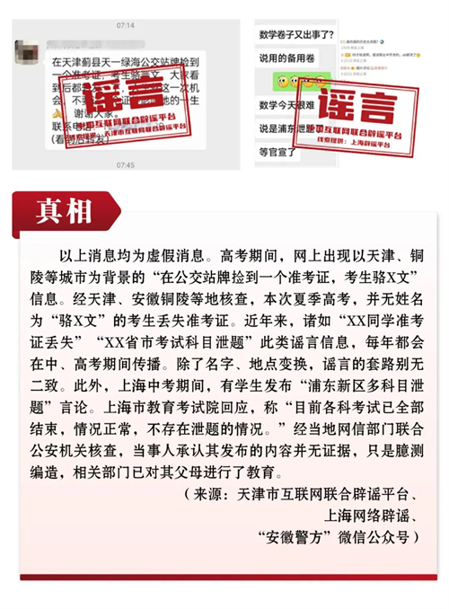 謠言7:天津、安徽等地考生“駱X文”丟失準(zhǔn)考證?上海浦東新區(qū)中考多科目泄題?