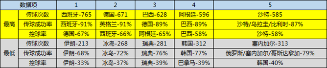 而在控球方面,崇尚傳控打法的球隊(duì)顯然會(huì)占據(jù)控球率的前列,但控球不等于贏球,將“Tika-Taka”玩的最熟練的顯然是西班牙,他們不僅有著場(chǎng)均765次的驚人傳球次數(shù)以及場(chǎng)均91%的傳球成功率,并依靠著前鋒迭戈-科斯塔的優(yōu)秀發(fā)揮,以小組第一順利出線;而與此形成鮮明對(duì)比的是一向以簡(jiǎn)單、高效打法著稱的德國(guó)隊(duì),居然也開(kāi)始走上了“Tika-Taka”的路線,3場(chǎng)小組賽,德國(guó)擁有32支球隊(duì)最高的控球率67%(比西班牙的66%還高),同時(shí)居然也擁有場(chǎng)均671次的傳球次數(shù)和89%的傳球成功率,但遺憾的是勒夫的“無(wú)鋒”戰(zhàn)術(shù),讓進(jìn)攻的最后關(guān)頭啞了火。