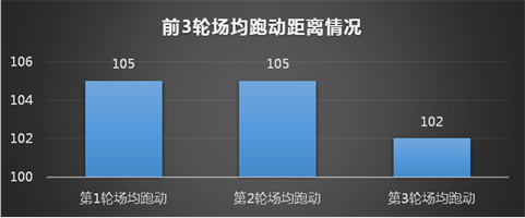 本屆世界杯小組賽,場(chǎng)均跑動(dòng)距離為104km,三輪的場(chǎng)均跑動(dòng)距離分別為:105km、105km和102km。