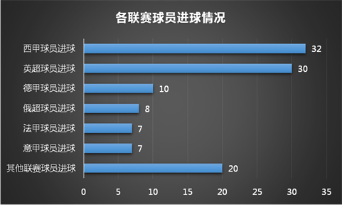 從小組賽進(jìn)球的球員所屬聯(lián)賽分布來(lái)看,來(lái)自14個(gè)國(guó)家的21名西甲球員包辦了最多的32粒入球,英超球員打入了30粒進(jìn)球排名第二,來(lái)自五大聯(lián)賽的德甲、法甲、意甲球員分別打入了10粒、7粒和7粒,值得一提的是,來(lái)自3個(gè)國(guó)家的5名俄超聯(lián)賽球員共打入了8粒進(jìn)球,排名第4,而來(lái)自廣州恒大淘寶的韓國(guó)球員金英權(quán)是中超球員打入世界杯入球的唯一球員。