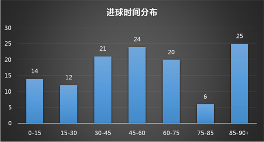 本屆世界杯讓大家印象深刻的是出現(xiàn)了多場(chǎng)比賽的絕殺與絕平的比賽,而從進(jìn)球時(shí)間分布來(lái)看,也印證了這一點(diǎn),據(jù)統(tǒng)計(jì),在比賽的85+分鐘進(jìn)球的數(shù)量達(dá)到了25粒,占總進(jìn)球的20.5%,其次是下半場(chǎng)開(kāi)場(chǎng)后的15分鐘,進(jìn)球數(shù)達(dá)到了24粒。